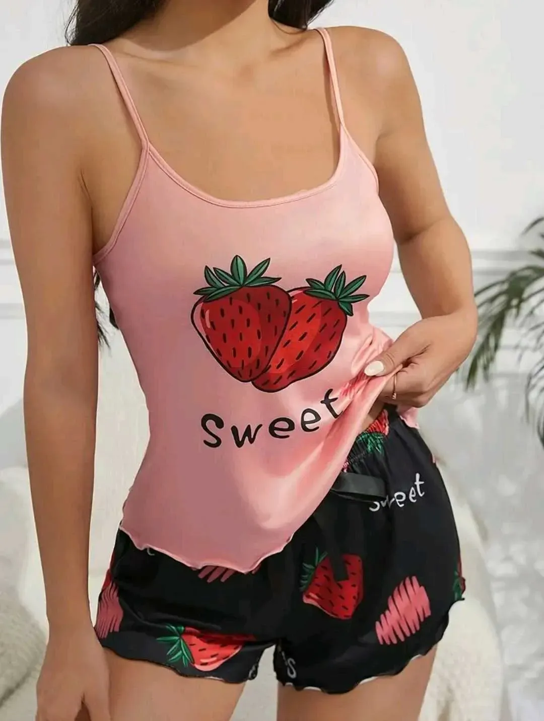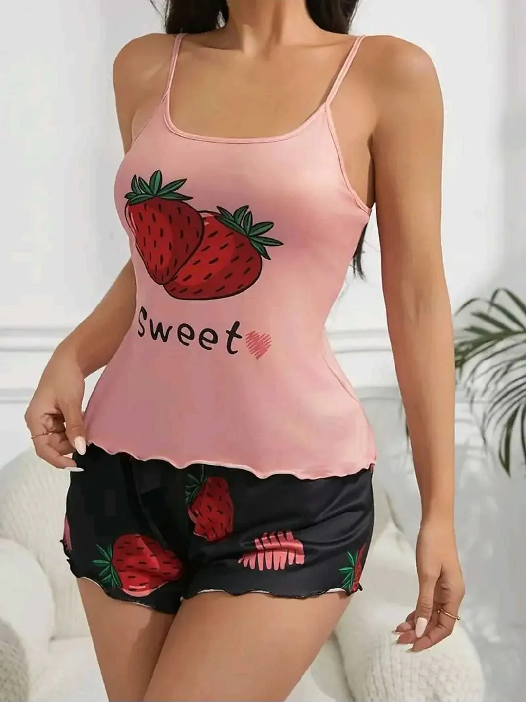 Conjunto de Pijama con Estampado de Fresas y la palabra dulce, Ropa de Dormir para todas las Estaciones